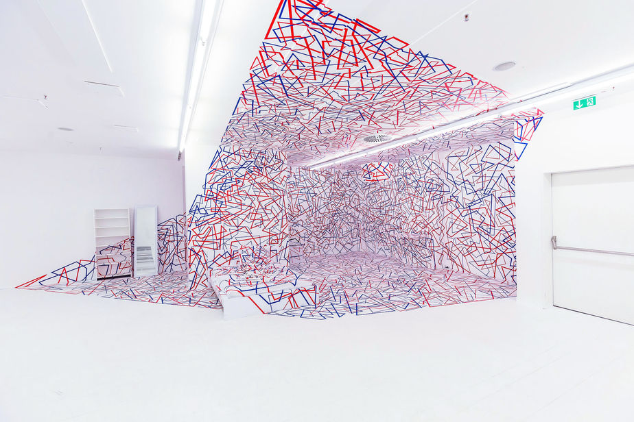 The extreme contrast created by the one-line tape installation — covering walls, ceiling, floor, and even the furniture — generated confusion and disorientation. At the same time, some visitors embraced the environment and transformed the showroom into their own performative stage, which was exactly the desired outcome.